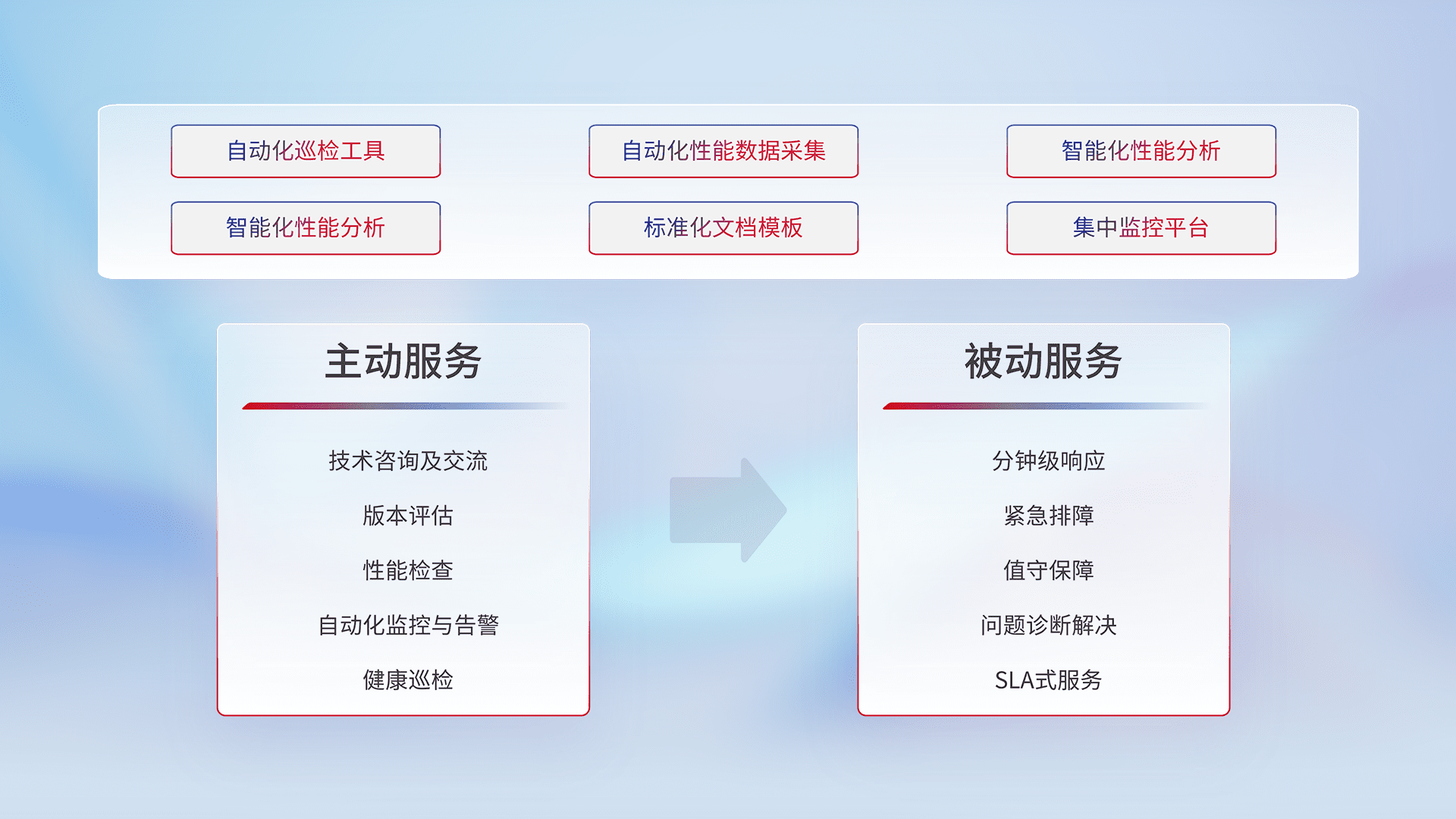 智能化工具和标准化文档,,保障服务质量,,,提供主动服务(包含技术咨询、、版本评估、、、、性能检查、、、、自动化监控与告警、、、、健康巡检)和被动服务包含(分钟级响应、、、紧急排障、、、、值守保障、、、问题诊断解决、、、、SLA服务)。。