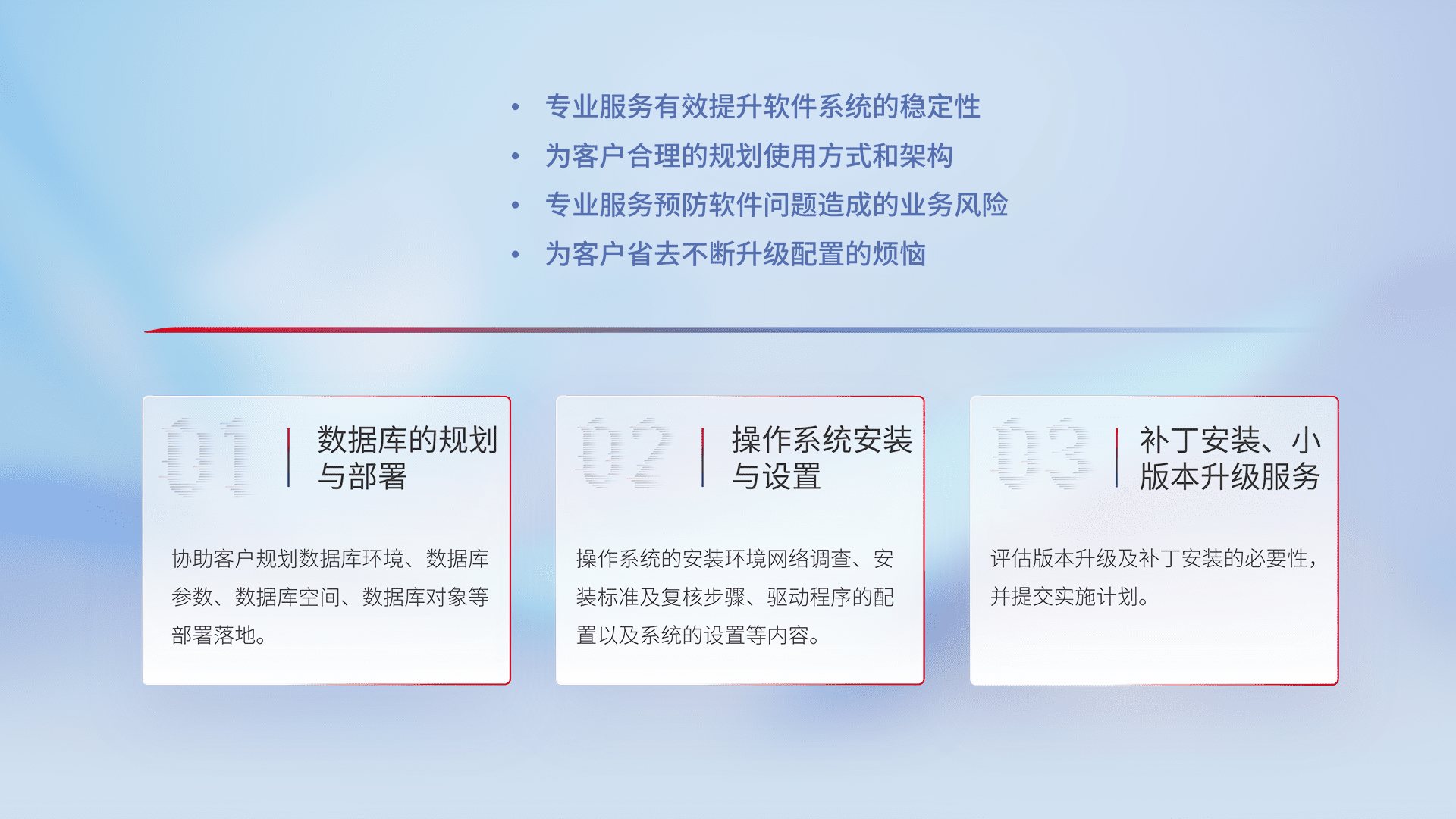 为客户提供软件规模升级、、、、快速部署、、、按需配置的专业服务,,,,从数据库的规划与部署到操作系统的安装与设置,,再到补丁安装和小版本升级提供支持。。。。