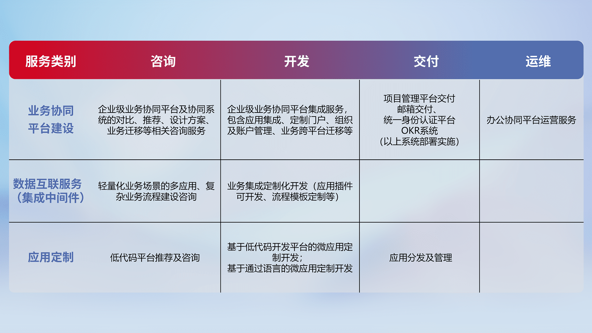 针对钉钉、、、、企微、、、IDaas等平台级产品提供产品的规划、、、、方案、、、、交付、、定制化开发等服务,,实现如统一协同办公、、、、智能客户服务、、混合会议管理、、智能数据查询、、、等业务场景,,,,实现数字化转型。。。。